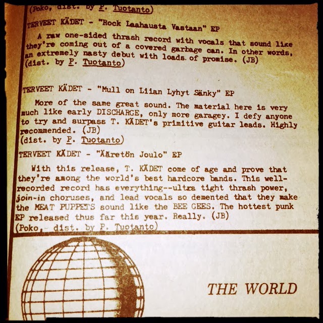 The issue that MRR went global. Until this point, the gang has clearly embraced the international appeal of punk but the scope of coverage lived in a funnel that was roughly Regional>National>UK National Acts ('77 hangers on/Disorder/Crass)>International DIY(very little covered until this issue). But with issue #3, the folks in SF received a care package from Finland that must have blown minds. International DIY records had, until this point, no worldwide distribution network, no magazine to promote to likeminded folks 5000 miles away — by and large, they existed only in the scenes that bore them. And Vote's care package to MRR may have changed all of that. Suddenly, the MRR folks were exposed to a large chunk of records that were as good or better as what they were doing at home; that, as best as they could tell, existed with the same Leftist leanings; that existed as a DIY enterprise. A thriving, brilliant hardcore scene. The Top Tens gushed all over this stuff, rightfully. It is pretty funny that MRR tries to claim the Finnish sound as their own despite the Finn's claim that they were primarily influenced by UK bands: